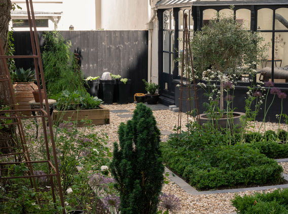 Dominated by a large chestnut tree this previously uninspiring garden was transformed with a smart new entrance and courtyard flowing into a garden designed to be viewed from the conservatory. Pleached hornbeam was used for privacy and to give structure to the garden whilst box lined beds overflowing with loose and relaxed planting gives seasonal interest.